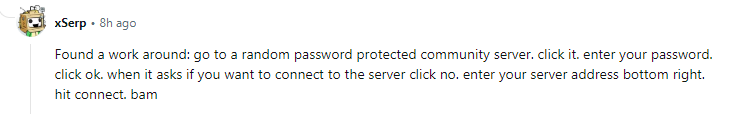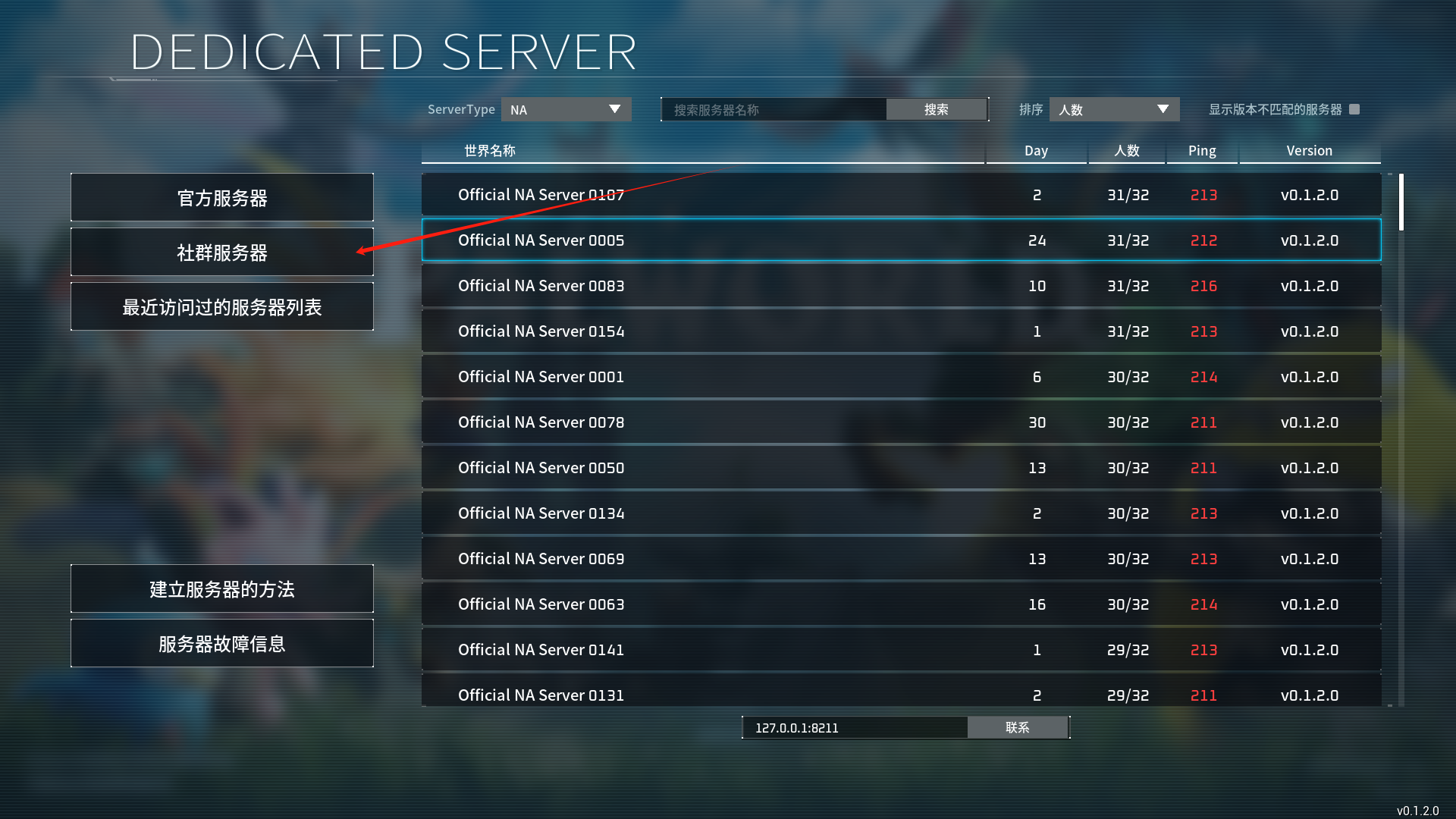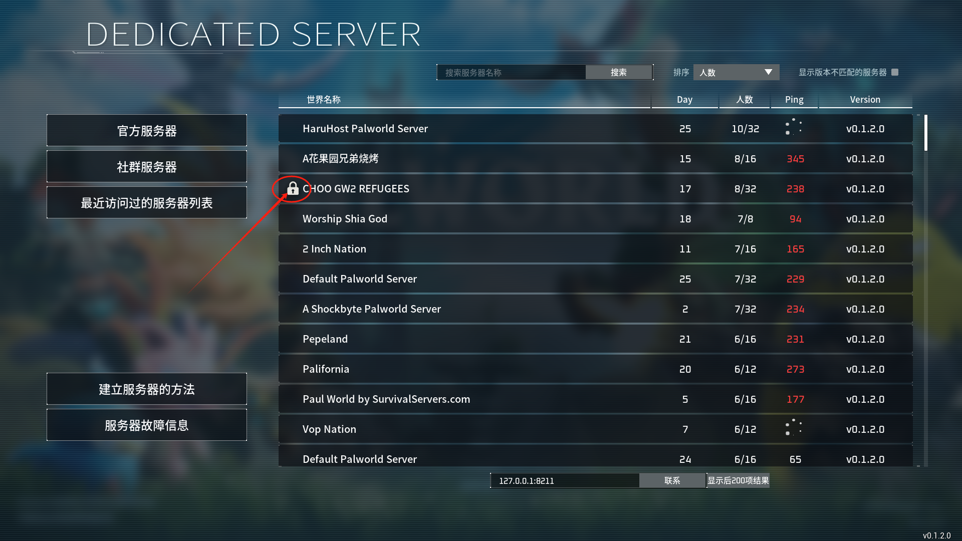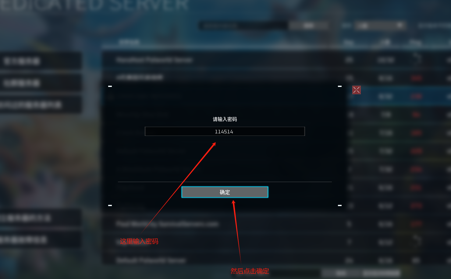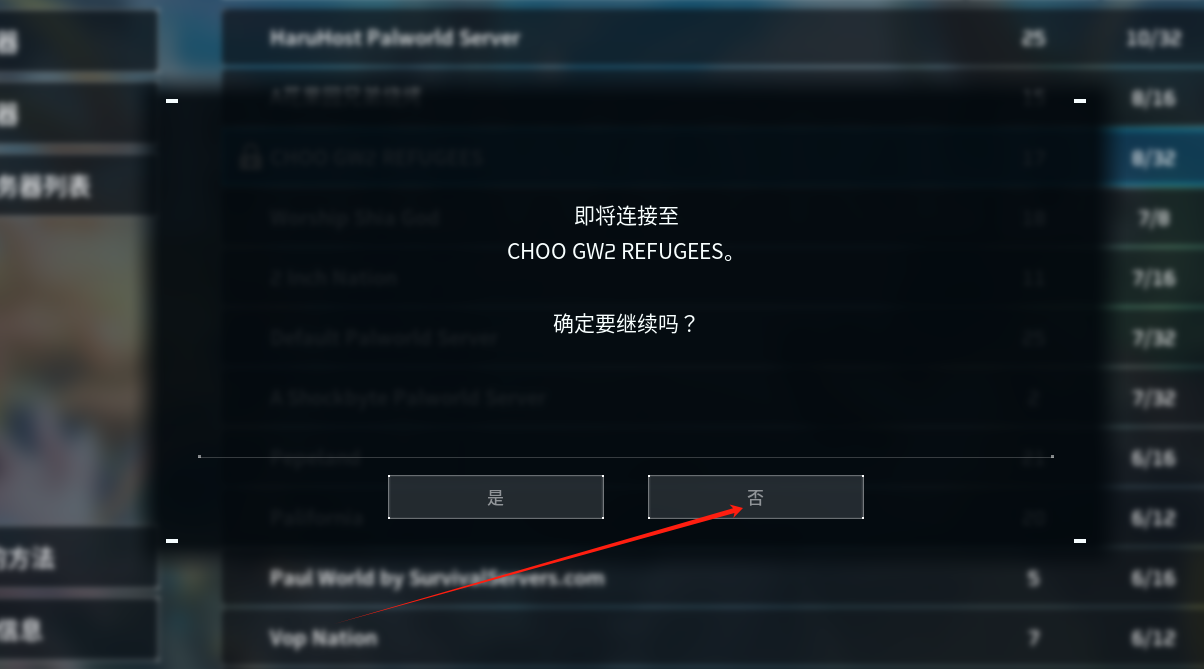 Andy手搓的PalWorld进服指南 2年前•有点用的东西•1676 阅•0 评 输入密码的方法 以下是图文教程1.选择加入多人服务器(专用服务器) 2.选择社群服务器 3.随机挑选一个带密码的服务器 4.输入密码 5.这一步非常重要 在点完确定之后不能进服务器 点击否 6.在下方连接处输入ip+端口 7.等待一会就可以进服玩耍了 赞(0) 分享 最后更新 2024-01-21
